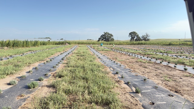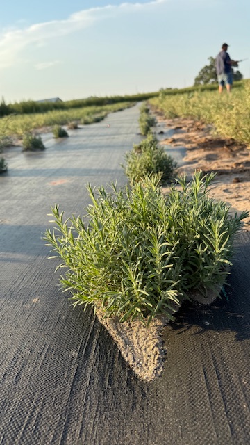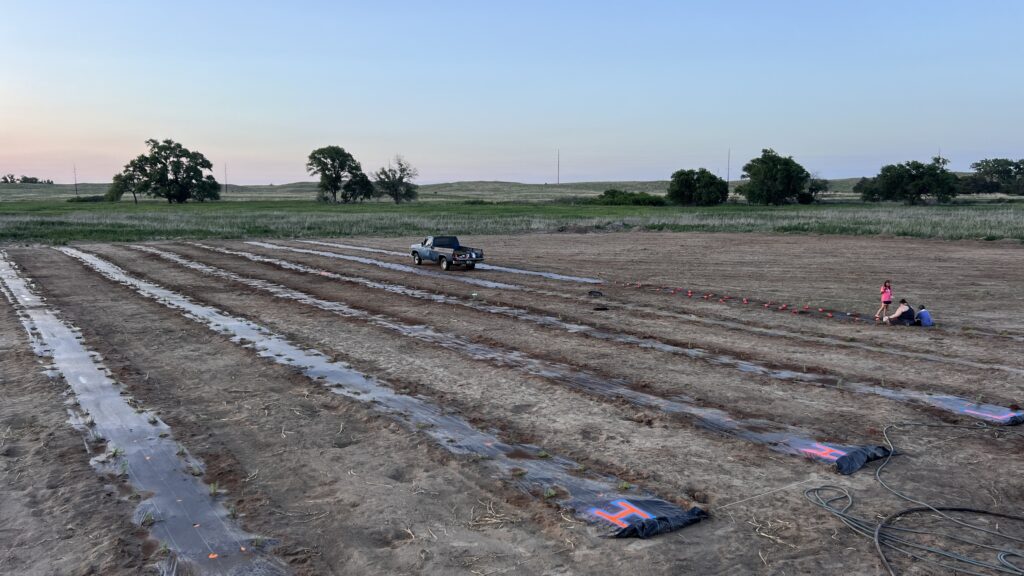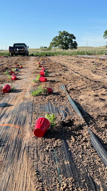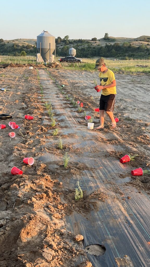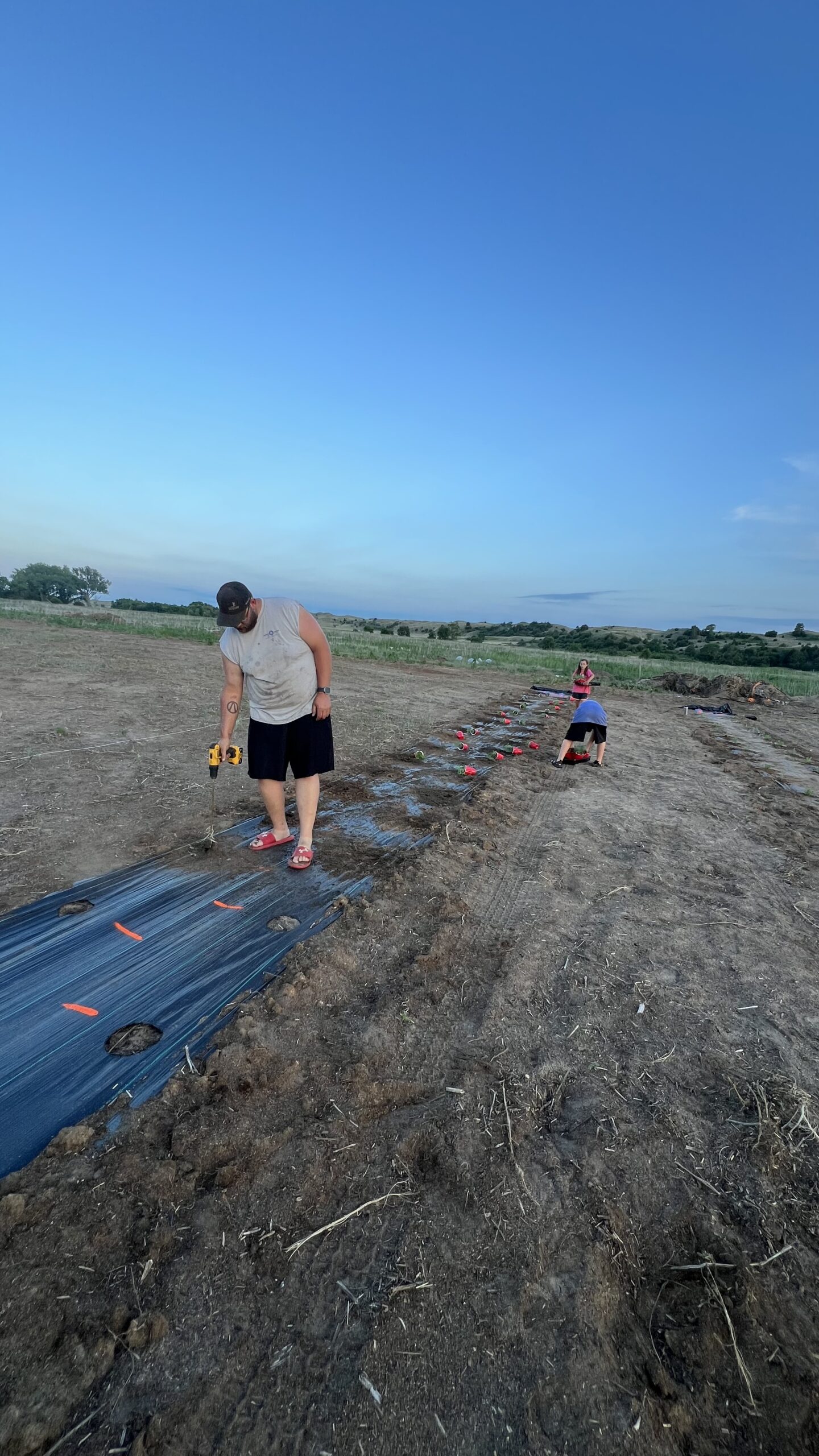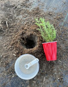 Andrew drilling holes to put plants in while Brian and Macy set out plants by each hole.