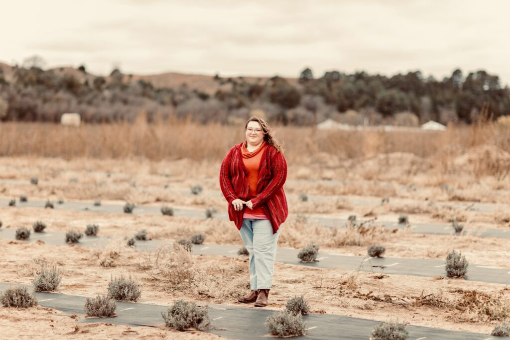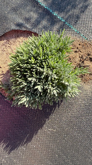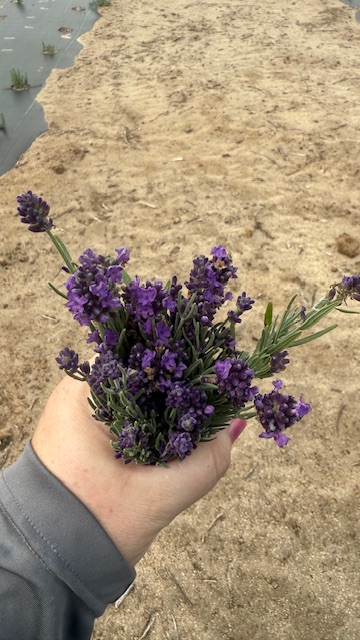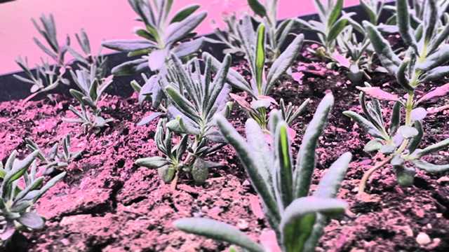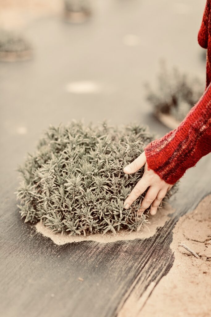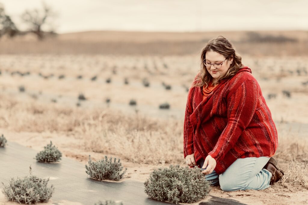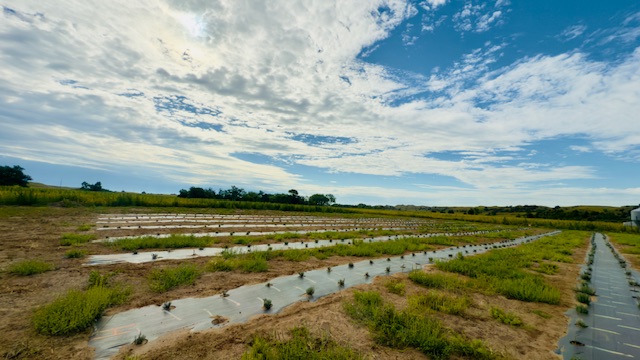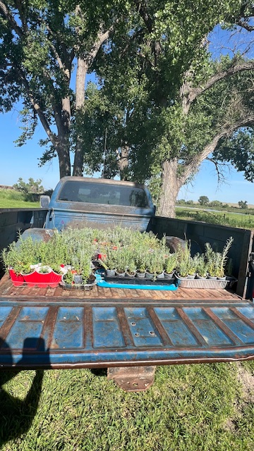 Andrew drilling holes to put plants in while Brian and Macy set out plants by each hole.
